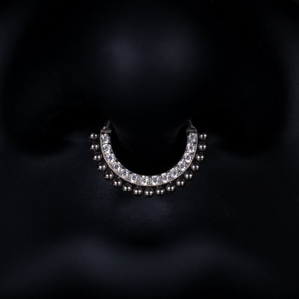 Titanový kroužek Falcon nabízí elegantní kombinaci čirých zirkonů a jemných 1mm kuliček rozmístěných po celé pohledové straně. Design má blízko k oblíbenému modelu Chloe, ale díky drobným kuličkám působí propracovaněji a dekorativněji. Falcon je ideální volbou pro ty, kteří chtějí něco jemného, ale přesto výraznějšího. Nejlépe vynikne v septu, daithu, forward helixu i klasickém helixu. Titanový kroužek je vyroben z hypoalergenního titanu ASTM F-136 (Ti-6Al-4V ELI). Nabízené průměry: 8 a 10 mm, šířka 1.2 mm.