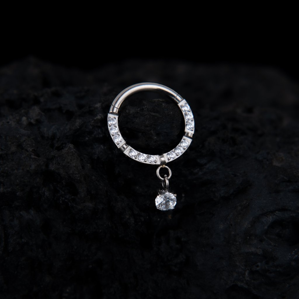Titanový kroužek Lumiera kombinuje zářivou linii čirých zirkonů s elegantním visacím přívěskem, který dodává šperku pohyb a jemný třpyt. Díky své velikosti působí decentně, ale přesto výrazně, obzvlášť při umístění ve forward helixu. Kroužek nabízíme v průměru 8 mm, v šířce 1.2 mm.