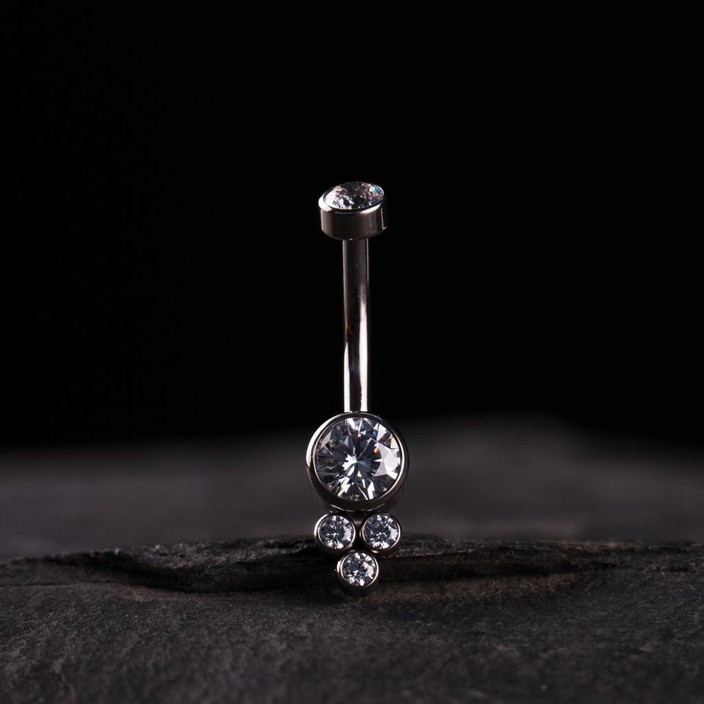 Piercing do pupíku Trinity Glow spojuje precizně zasazený centrální zirkon se třemi menšími kamínky, které vytvářejí jemný efekt kapek. Tento belly button / navel piercing působí minimalisticky, ale zároveň s nádechem luxusu.